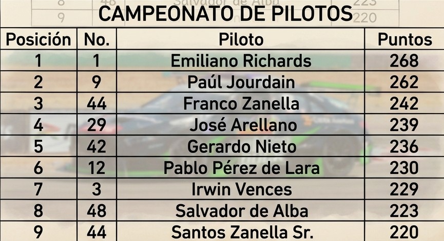 Emiliano Richards (MG), Paúl Jourdain (Power Duck) y Franco Zanella (Z Motors) llegan encabezando las posiciones de la GTM Pro 1 en la Súper Copa Roshfrans, con miras a la fecha en el Autódromo de León, Guanajuato. La competencia se mantiene reñida, con solo 26 puntos de diferencia entre el líder y el tercero.