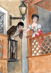Así, por las noches, los dos se reunían en secreto, hablando y besándose de balcón a balcón en el callejón estrecho.